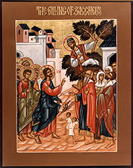 يخبرنا الإنجيلي لوقا عن زكا أنه كان قصير القامة وعندما عرف بدخول المسيح إلى أريحا تاق إلى رؤيته ولكنه ولقصر قامته لم يستطع بسبب الجموع الكثيرة التي كانت تحيط بالسيد فصعد إلى جميزة ليراه فشاهده يسوع وطلب منه النزول لانه سيمكث عنده وينتهي الإنجيل بقول السيد له المجد: اليوم حصل خلاص لهذا البيت.