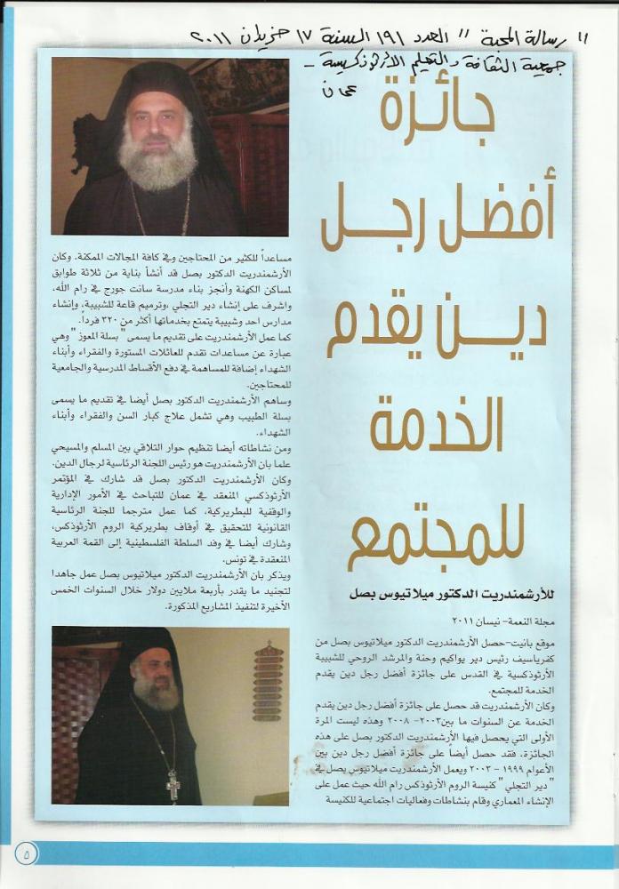 أحر التهاني واجمل التبريكات لقدس الأب الأرشمندريت ميلاثيوس بصل الجزيل الإحترام بمناسبة نيله جائزة افضل رجل دين يقدم الخدمةً للمجتمع. سائلين الله عزّ وجل أن يديمه ذخراً وسنداً لما فيه خير الرعية والمجتمع . ولسنين مديدة يا سيد .