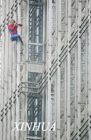 دخل الان روبرت الذى كان يرتدى ملابس الرجل العنكبوت برج جينماو فى حوالى الساعة 2:30 مساء امس وبدأ التسلق من البوابة رقم 6 بالبرج . ولم يعلم مديرو البرج ان احدا سيقدم على هذا العمل المثير.![]()