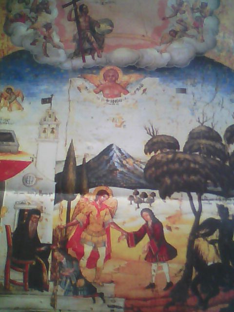 نرى في أعلى الإيقونة ملائكة بأجنحة مذهبه ينتفخون الأبواق فرحين حول دائرة الثالوث الأقدس الذي يمسك العالم بيده وتحته ملاك يمسك بيديه الآية " يكون فرح قدام ملائكة الله بخاطئ واحد يتوب " كما يظهر أسفل الإيقونة ملاكاً يقود التائب ماسكا بيده إلى الاعتراف للأب الروحي الجالس أمام الكنيسة لابساً جبته وبطرشيله ويظهر فوق الملاك آية مكتوبة " حارس الروح الذي يقود الخاطئ إلى الاعتراف وعند قدمي الأب يظهر التائب راكعاً يعترف طالبا المغفرة , وتحت قدميه سلاسل الخطيئة التي كان مكبلا بها وقد انحلت وتقطعت رمزاً لإنعتاقه من خطاياه وفوق رأس الأب الروحي مكتوب " أب روحي يعرف " ويظهر كذلك على يمين الإيقونة الأسفل شيطانين أسودين ولهما قرون وأنياب ومكتوب فوقهما :" الشياطين التي انسحقت من توبة واعتراف الخاطئ " وفوق الكنيسة صوره إنسان راقد في قبر مفتوح وعلى علو قليل منه يظهر ملاكين في داخل سحابه يمسكان روحه على هيئة طفل مولود رمزاً لخلاصه