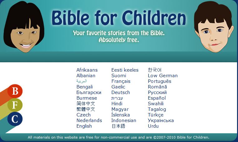 موقع جميل جداً يتكلم عن الإنجيل المقدس بشكل قصص بسيطة وملونة للأطفال كما ويحتوي على كتب للتحميل للتلوين ومتوفر بلغات عديدة