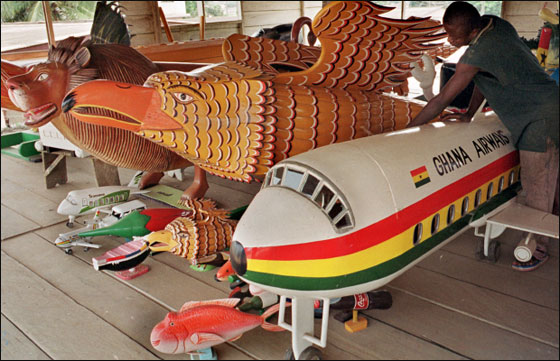 وأضاف "ذات مرة طلب زعيم قبيلة كرسيا يحمل عليه على شكل جذع شجرة كاكاو، وبشكل غير متوقع توفي قبل المهرجان، وتم دفنه في الحمالة ذاتها. وبعد فترة وجيزة توفيت جدتي التي كانت تحلم دائما بالسفر. فصنع جدي لها نعشا على شكل طائرة". والآن، ييبلغ أنانغ من العمر 25 عاما، ويقول انه لم يكن أبدا أكثر انشغالا، مشيرا إلى أنه تلقى دعوة للمشاركة في "المهرجان الأسود العالمي" الثالث في داكار في ديسمبر/كانون أول المقبل.