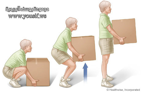 الحل: أن ترفع بشكل صحيح، عن طريق ثني الركبتين والوركين بحيث تجلس القرفصاء، الرفع، مع رفع عضلات الساق الخاص بك عن طريق استقامة الركبتين والوركين ( كما موضح بالصورة ) .