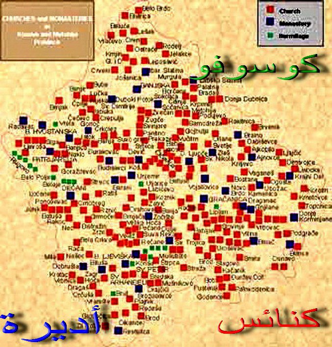 هيّ خريطة لإقليم كوسوفو .. موضح فيها الأديرة ( المربعات الزرق ) و الكنايس ( المربعات الحمر ) ..