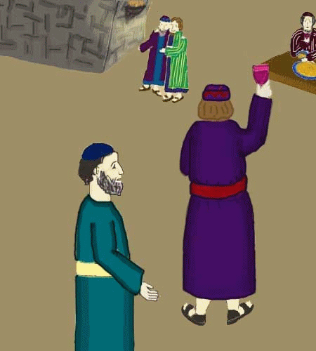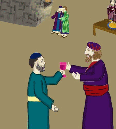فقالت أمه للخدم: « مهما قال لكم فافعلوه ». وكان هناك ستة أجران من حجر لما تقتضيه الطهارة عند اليهود، يسع كل واحد منها مقدار مكيالين أو ثلاثة
