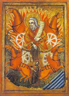 رفعه الله في مركبة نارية حياً إلى السماء، و أيقونة النبي ايليا تعبير لهذا المشهد، إذ صعد بالمركبة و ترك رداءه إلى النبي أليشع الذي كان يرافقه والذي أصبح خلفاً له بعد أن أرسل له النعمة بواسطة ردائه الذي تركه له. و يقول عنه الذهبي الفم :"وقد كان مسيطراً على لجج المياه،وبكلمة لسانه كان يرسل المطر بغزارة وكأنه يحمل مفاتيح السموات.لقد كان في آن واحد فقيراً و لكنه يغني الكثيرين، و كان غنياً لن لسانه كان يوزع سحاب المطر".
