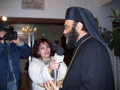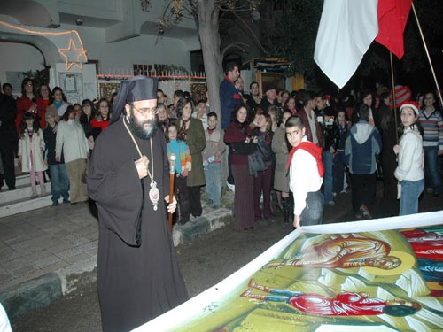 ثم يتابع الموكب السير باتجاه مقر مطرانية طرطوس للروم الأرثوذكس ( وهو هذا العام يعد المقر القديم كون المطرانية انتقلت إلى جوار كنيسة رقاد السيدة) حيث يكون باستقبالهم سيادة المتروبوليت باسيليوس (منصور) الجزيل الاحترام و كهنة رعايا طرطوس و جمع غفير من المؤمنين إضافة لحضور مميز من التلفزيون العربي السوري حيث يجري حيثاً مختصراً عن الميلاد مع سيادة المتروبوليت وبعدها تقوم فرقة المراسم بعزف أناشيد الميلاد و تقديم كل ما لديها من أنغام شجية بعدها يتابع الموكب سيره نحو كنيسة القديس دانيال العمودي حيث تقرع أجراس الكنيسة باستقبال الموكب.