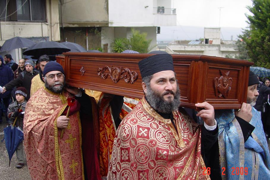 وتحت المطر، سار المؤمنون وراء القديس يعقوب ورفاقه يتقدمهم النائبان فريد حبيب ونقولا غصن ورئيس دير حمطورة ورهبان الدير والعديد من كهنة البلمند وطرابلس والكورة وفرق الكشافة وحملة الصور والزهور. وفي وسط ساحة كوسبا، انزل الرفات من السيارات ووضع على اكتاف الكهنة وصولا الى كنيسة مار سارجيوس وباخوس.